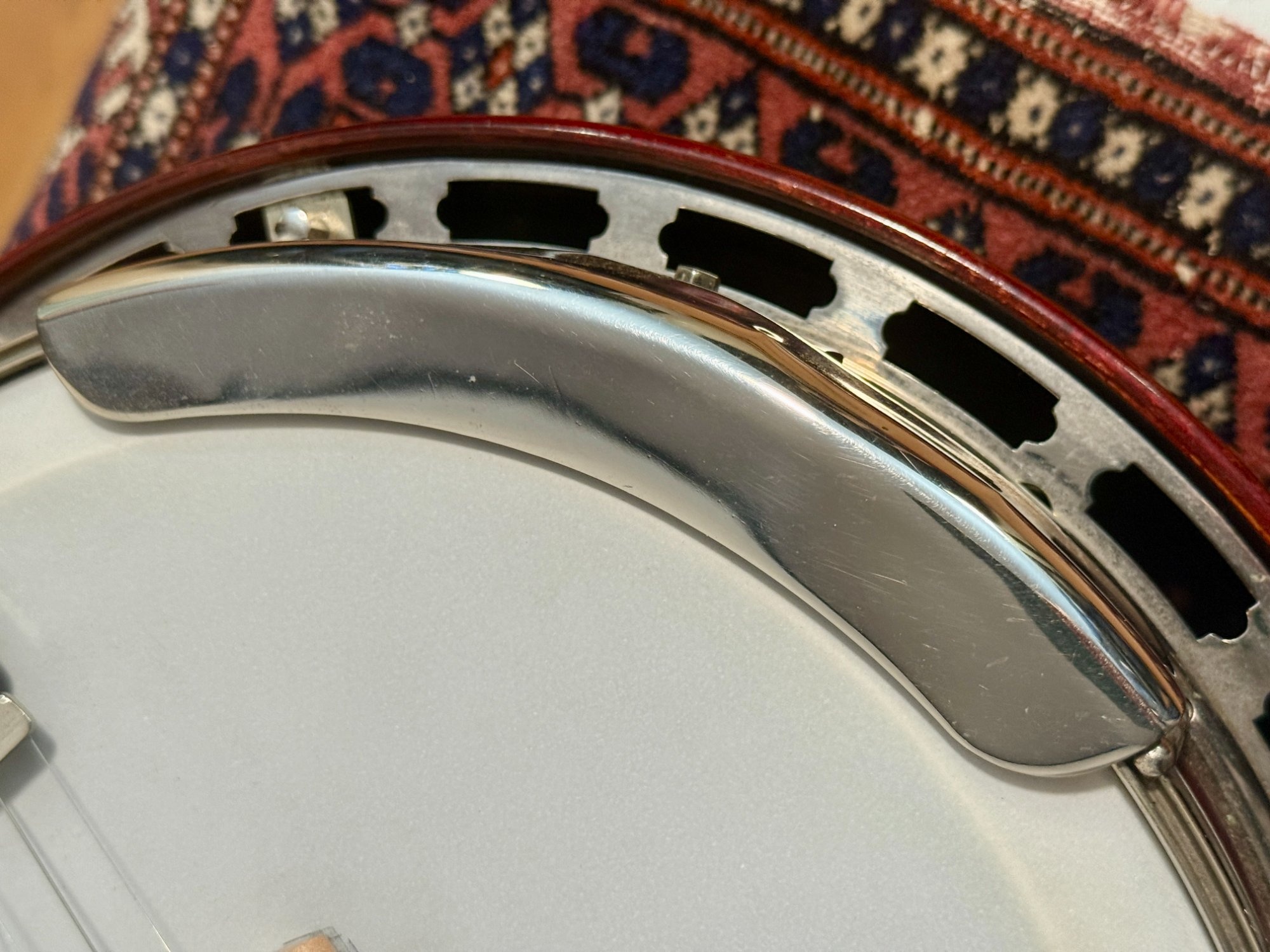 Gibson’s ball-bearing tone ring (1925-1927) used springs, washers, and ball bearings to suspend the tone ring above the wooden rim, allowing it to vibrate freely with the head. This produced a warm, complex tone distinct from later cast archtop and flathead designs. Learn more about vintage Gibson banjos in our collection.