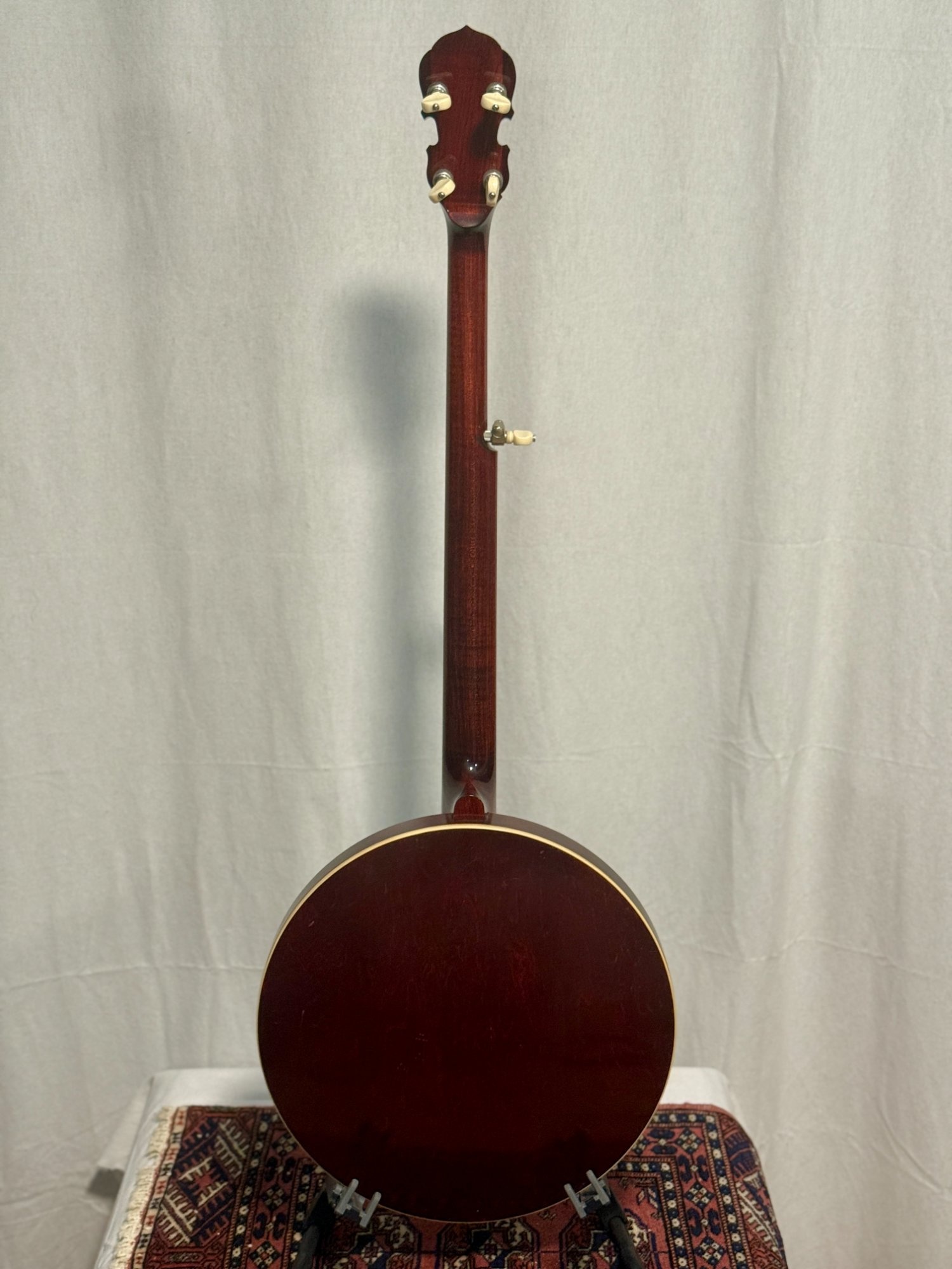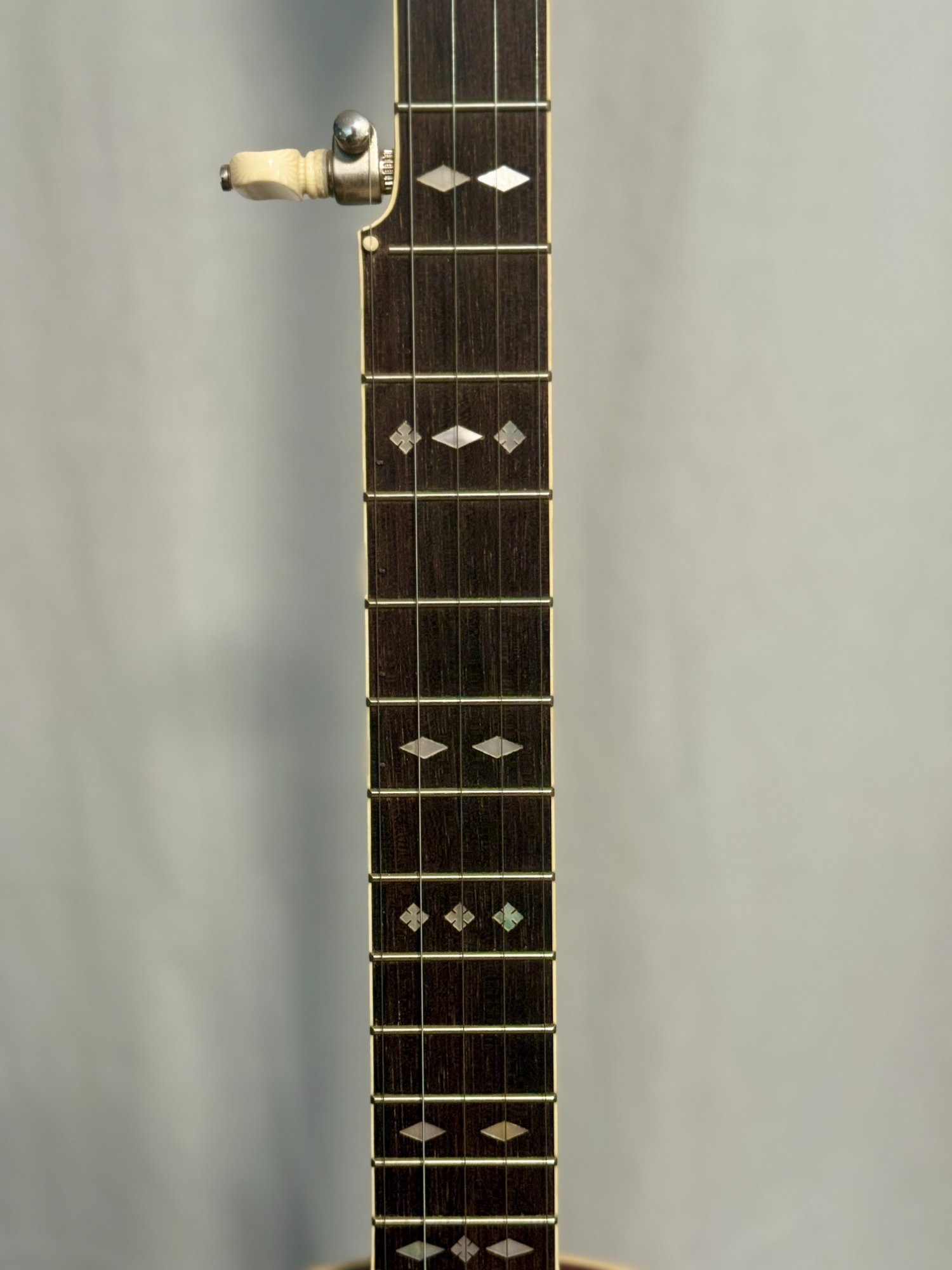 The original tenor neck has been replaced with a professional 5-string conversion neck by Frank Neat. Straight-grained maple construction matches the resonator beautifully. The rosewood fingerboard features the classic diamonds and squares pearl inlay pattern, and the fiddle-shaped peghead carries the Gibson Mastertone pearl logo. Planetary tuners with ivoroid buttons.