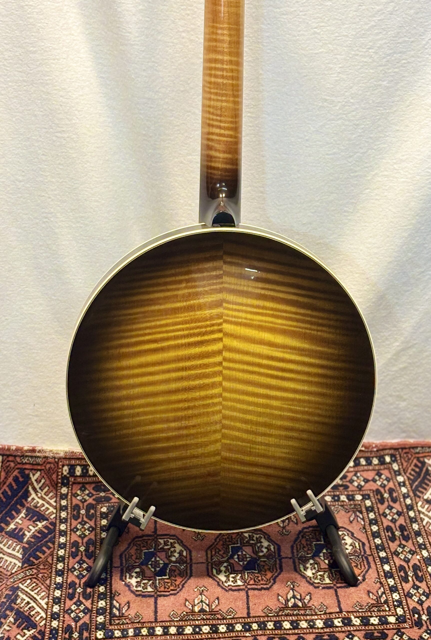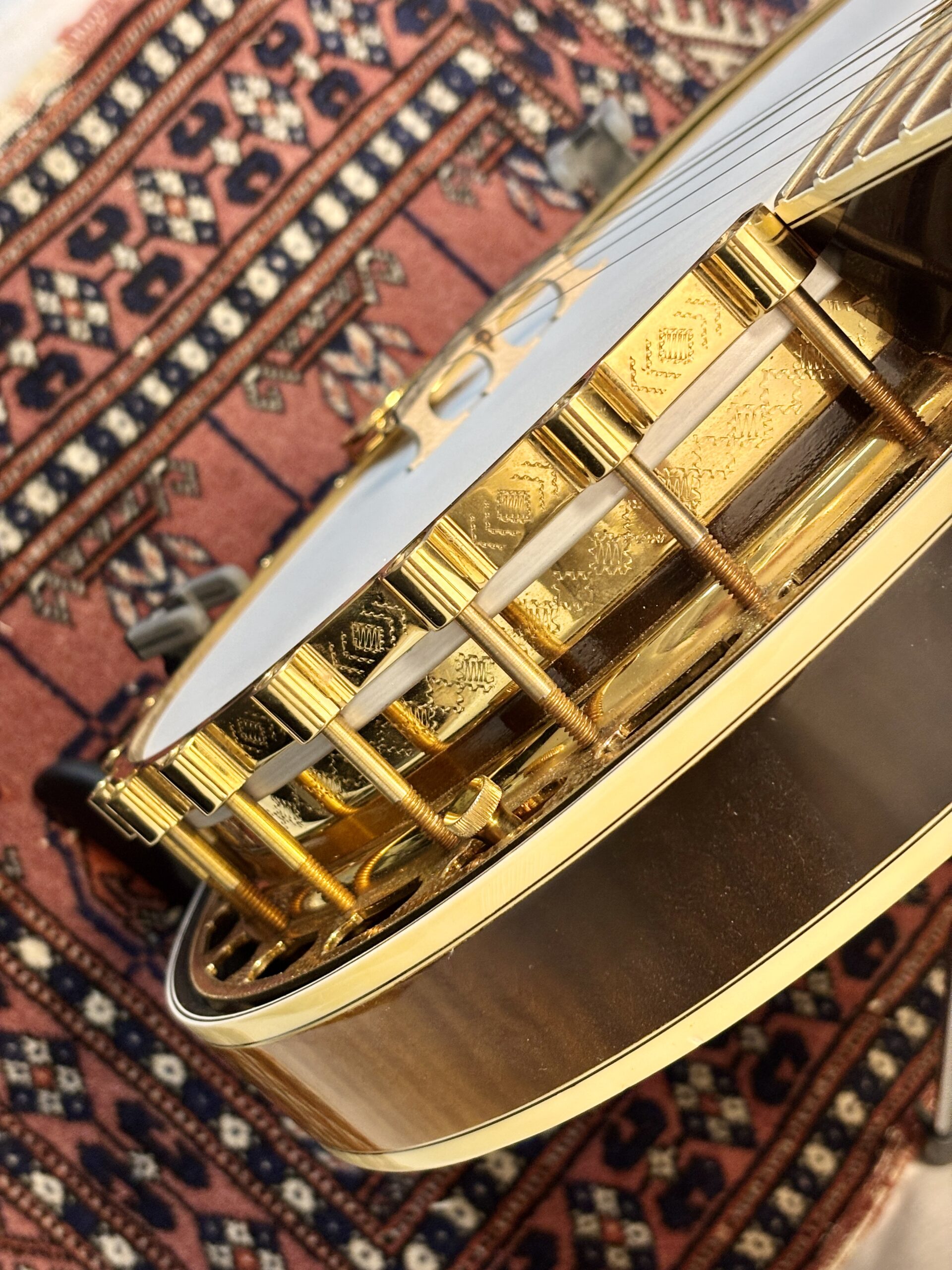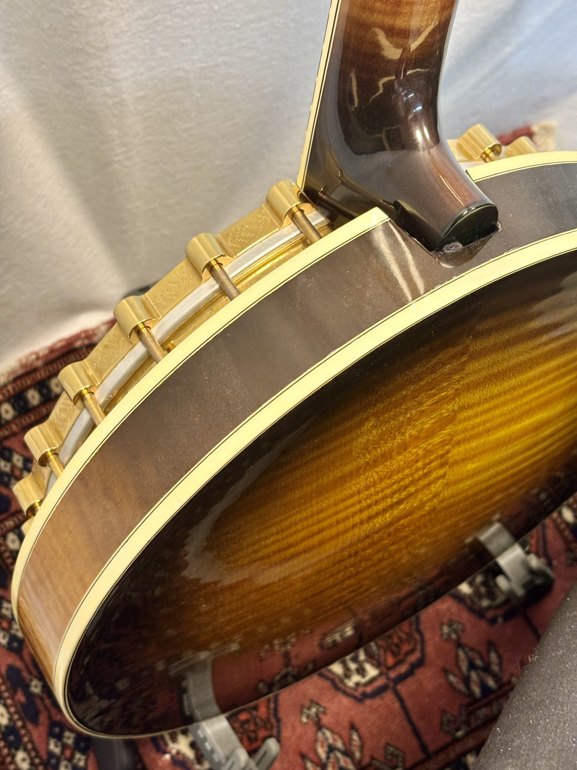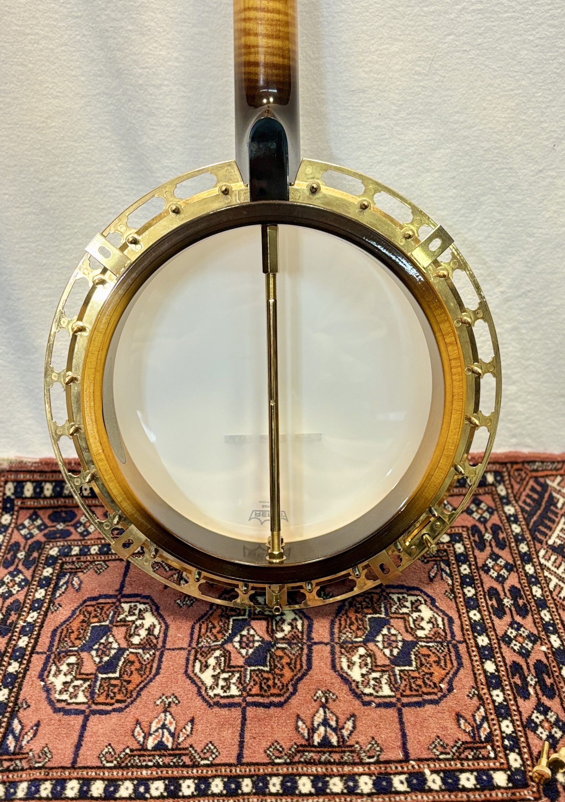 This 2005 example features a 20-hole Kulesh Gibson USA tone ring, rosewood fingerboard with Art Deco bowtie inlays, curly maple neck, and a stunning flamed maple resonator with tobacco sunburst finish and dished back. Gold-plated hardware throughout includes the engraved armrest, engraved tailpiece, and engraved tension hoop. The tuners feature amber-colored buttons.