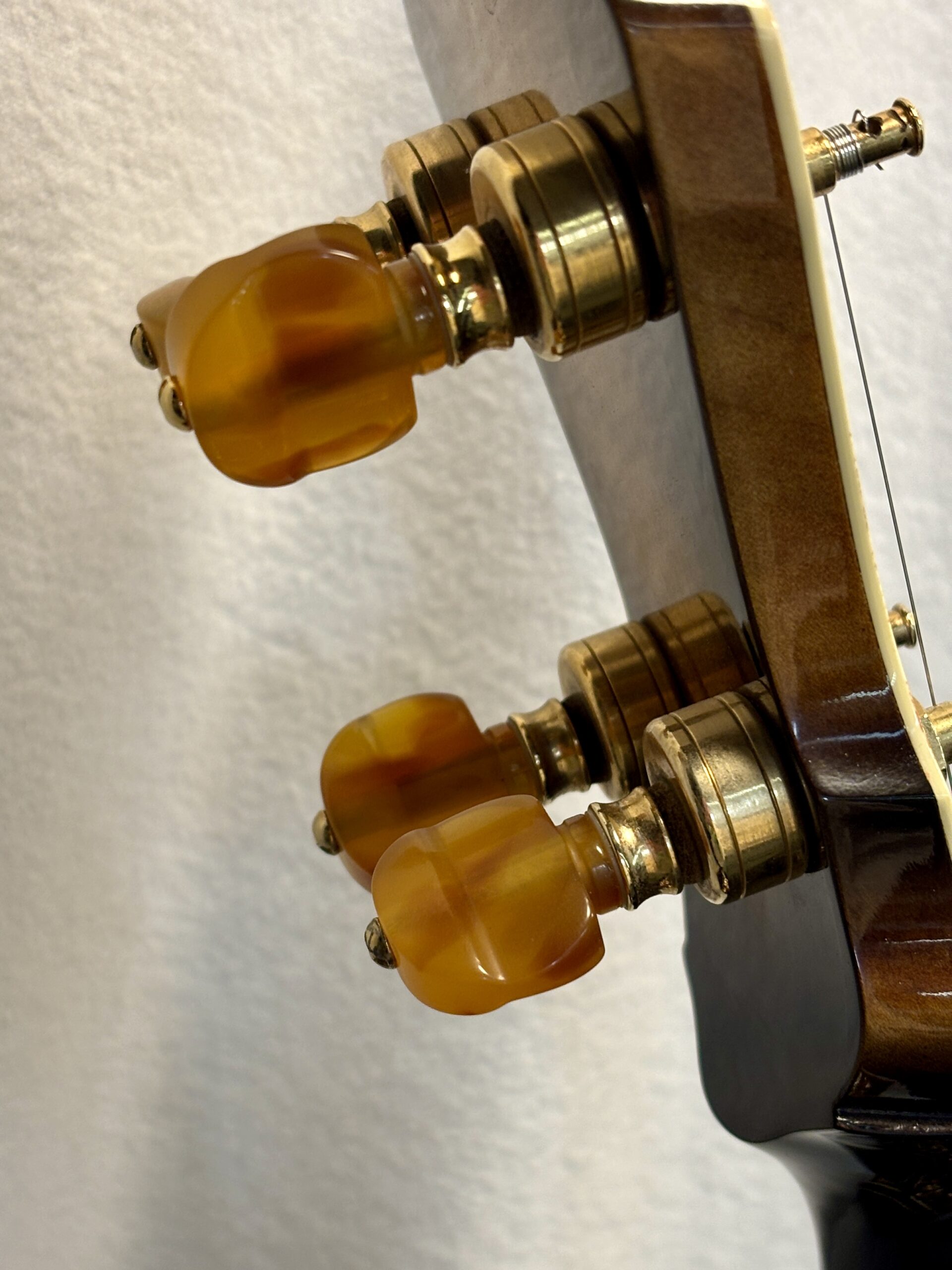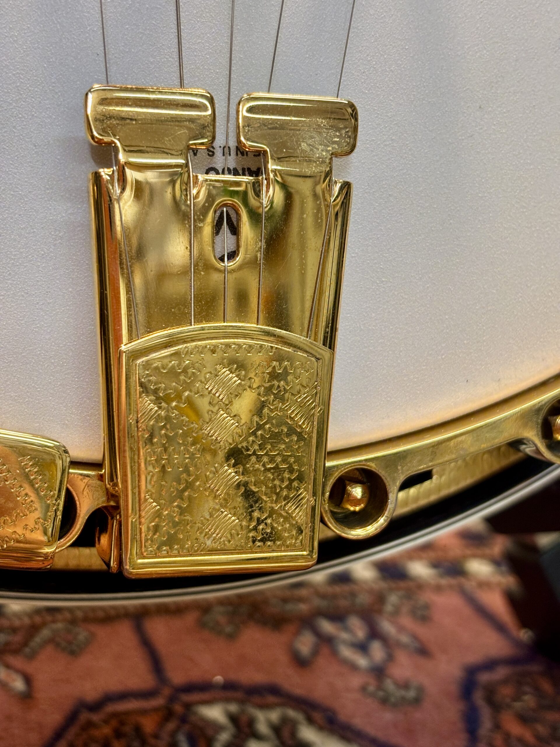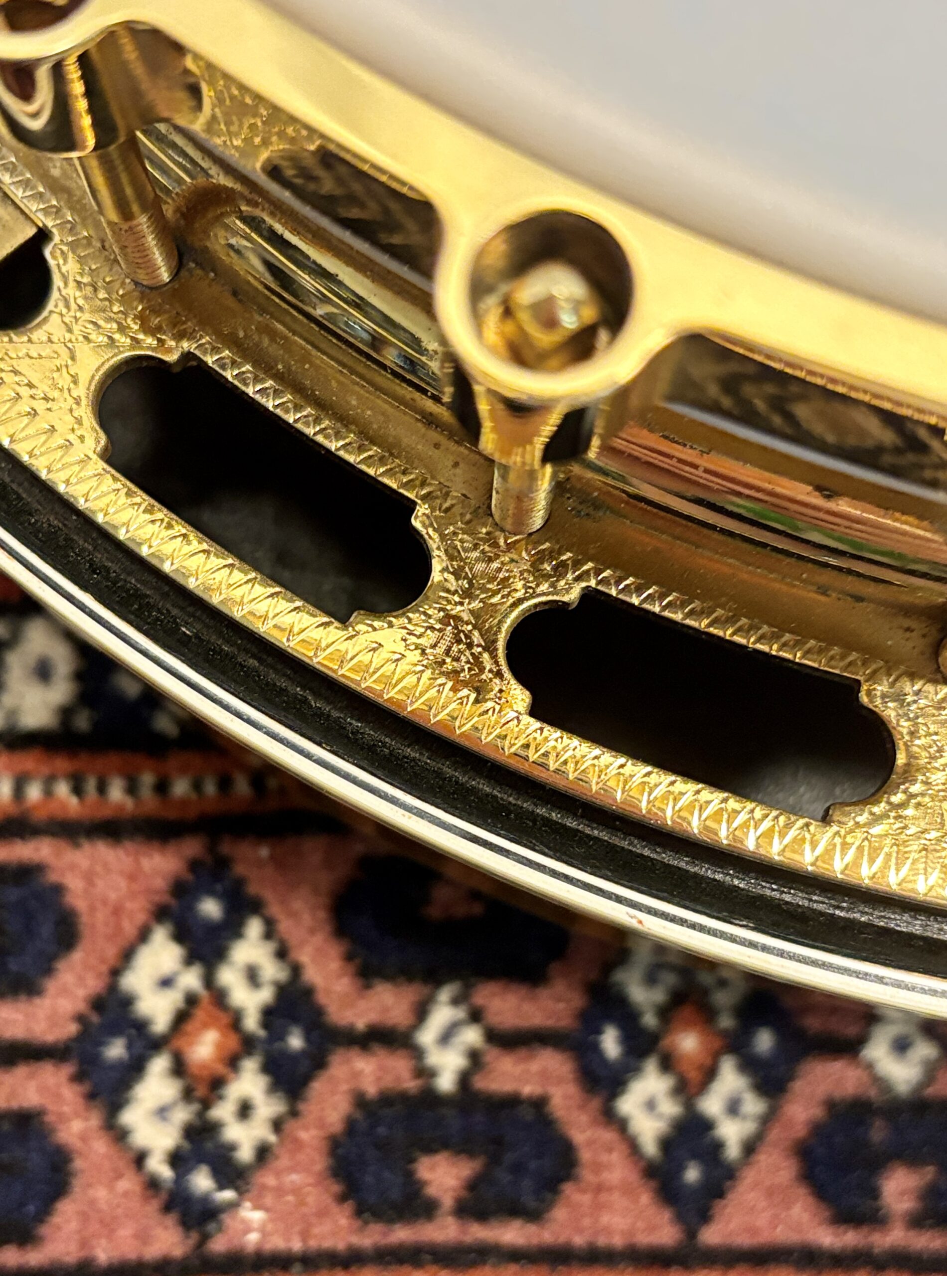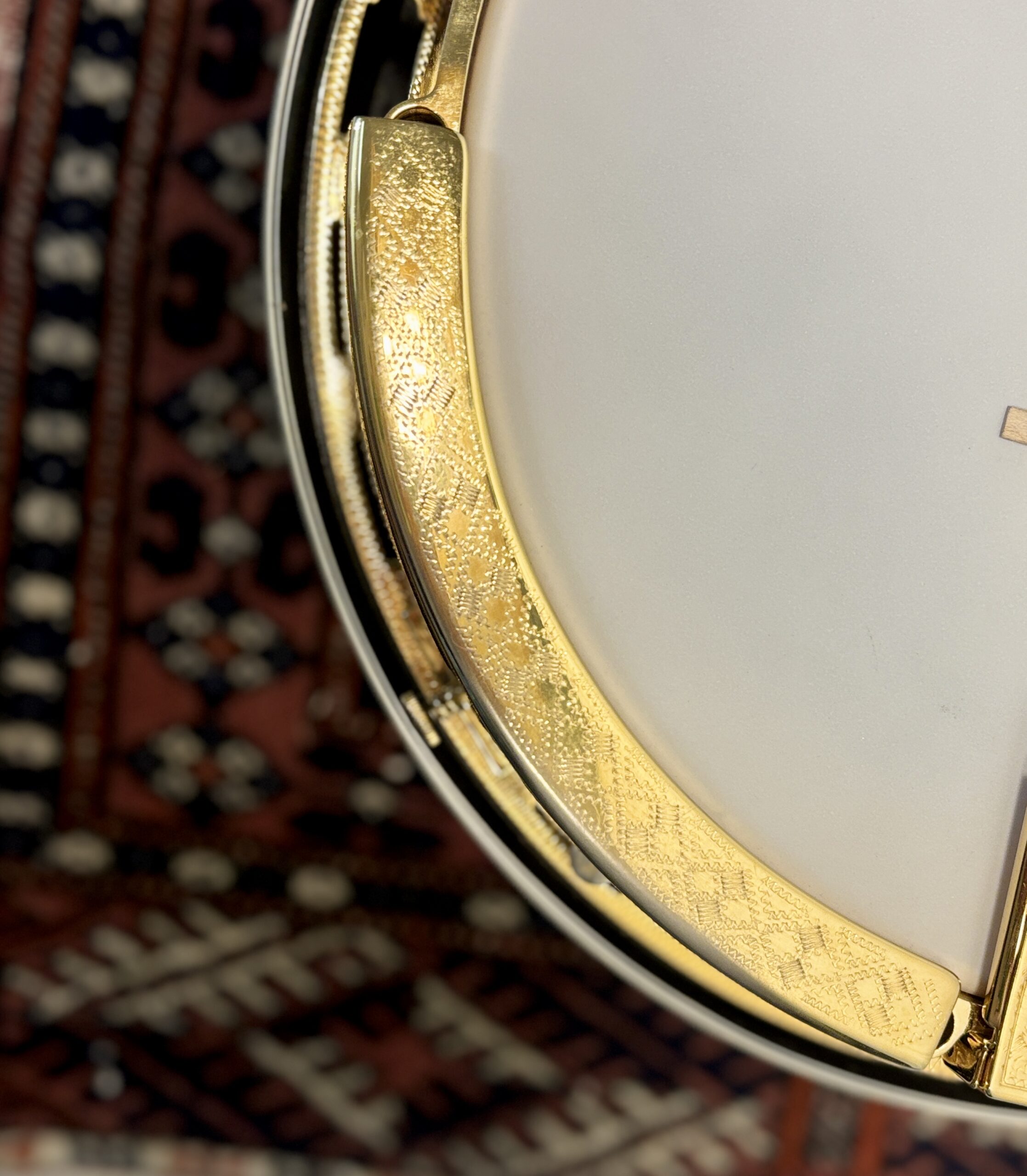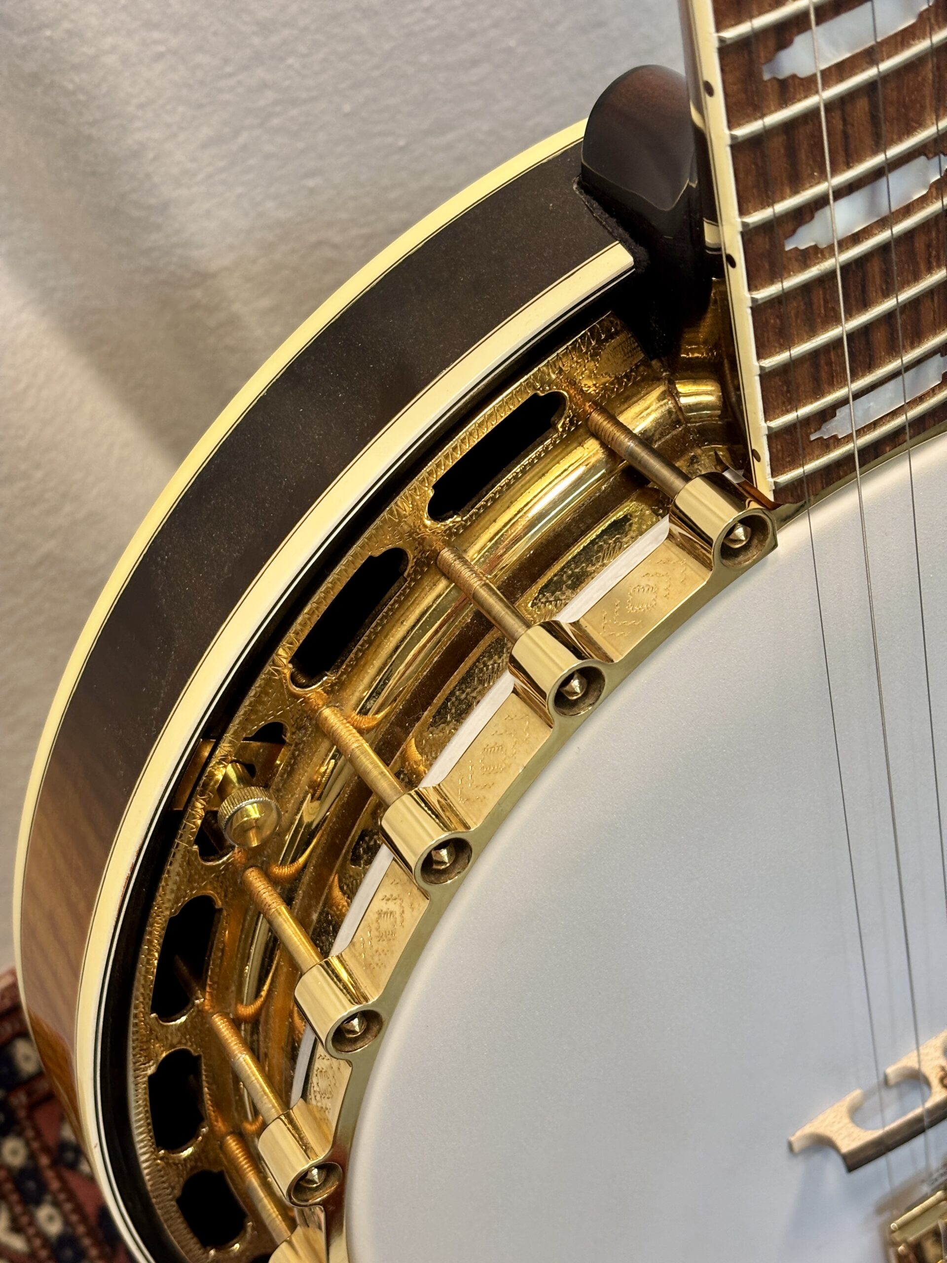 This 2005 example features a 20-hole Kulesh Gibson USA tone ring, rosewood fingerboard with Art Deco bowtie inlays, curly maple neck, and a stunning flamed maple resonator with tobacco sunburst finish and dished back. Gold-plated hardware throughout includes the engraved armrest, engraved tailpiece, and engraved tension hoop. The tuners feature amber-colored buttons.