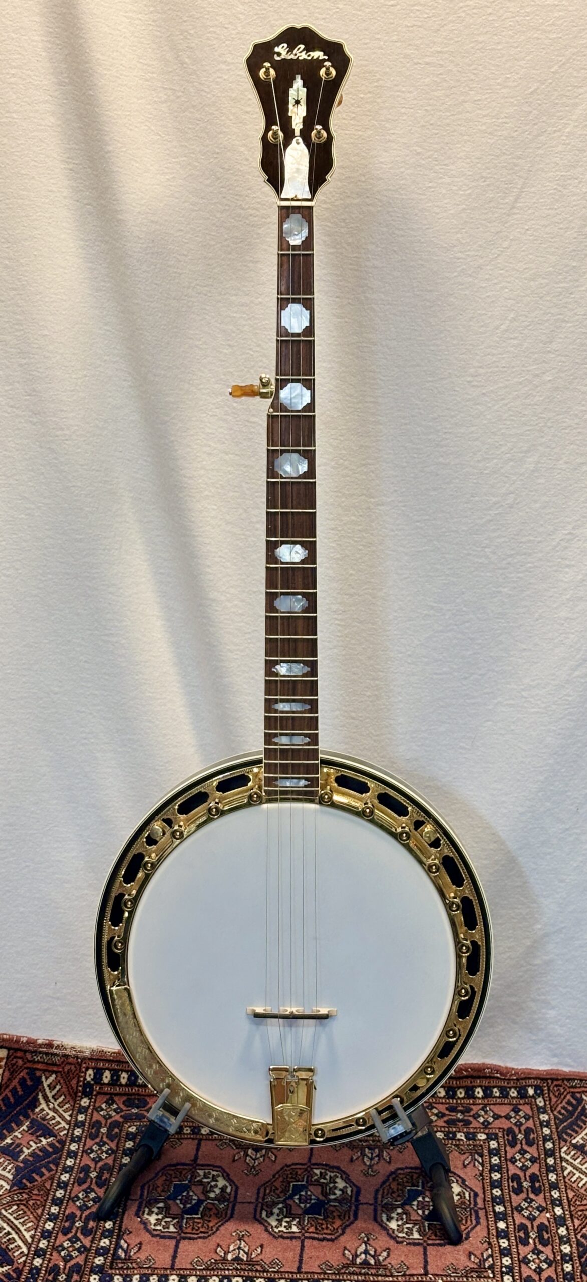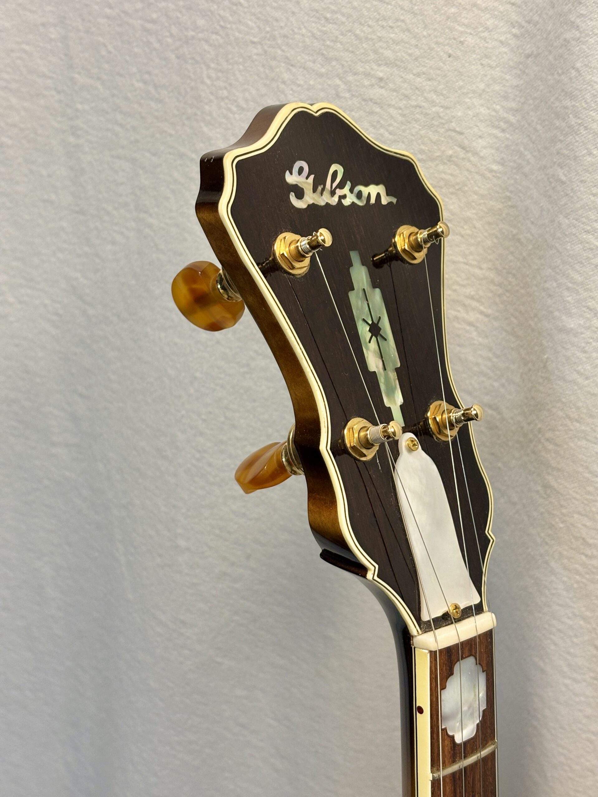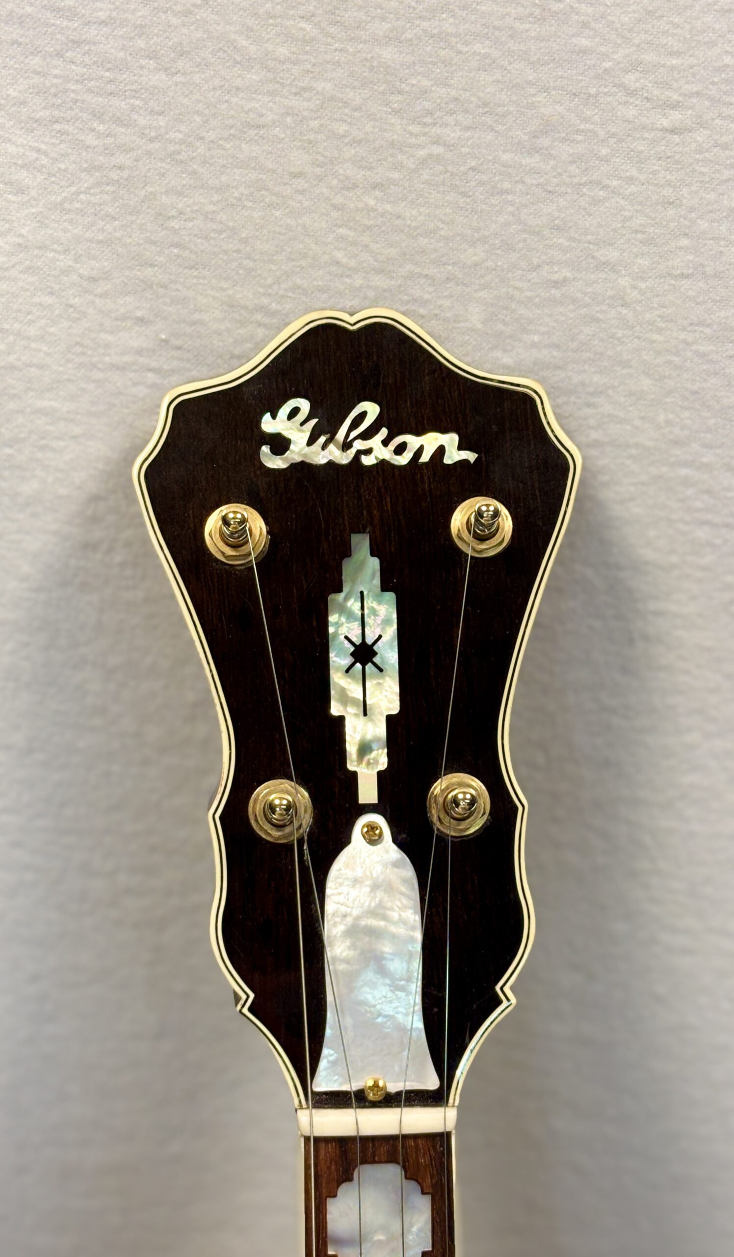 One of the most rare Gibson 5-string banjos of them all, the RB-18 was the highest top-tension model and was originally only sold for three years (1938-1940). With their from-the-front head adjustment, radiused fingerboard, Art Deco inlays, and carved-back resonator, the original top-tension models were designed to make earlier Mastertones obsolete both visually and structurally.