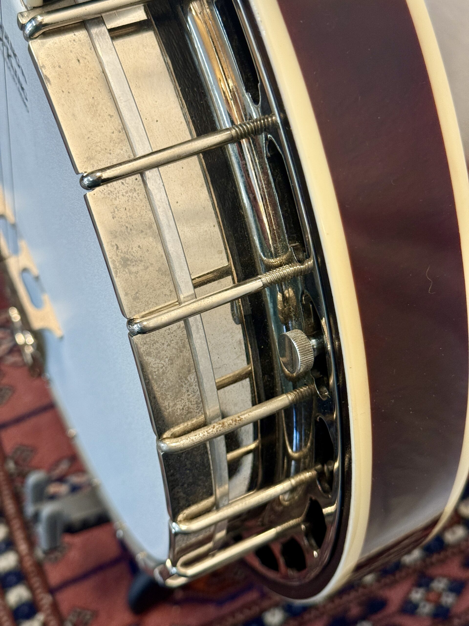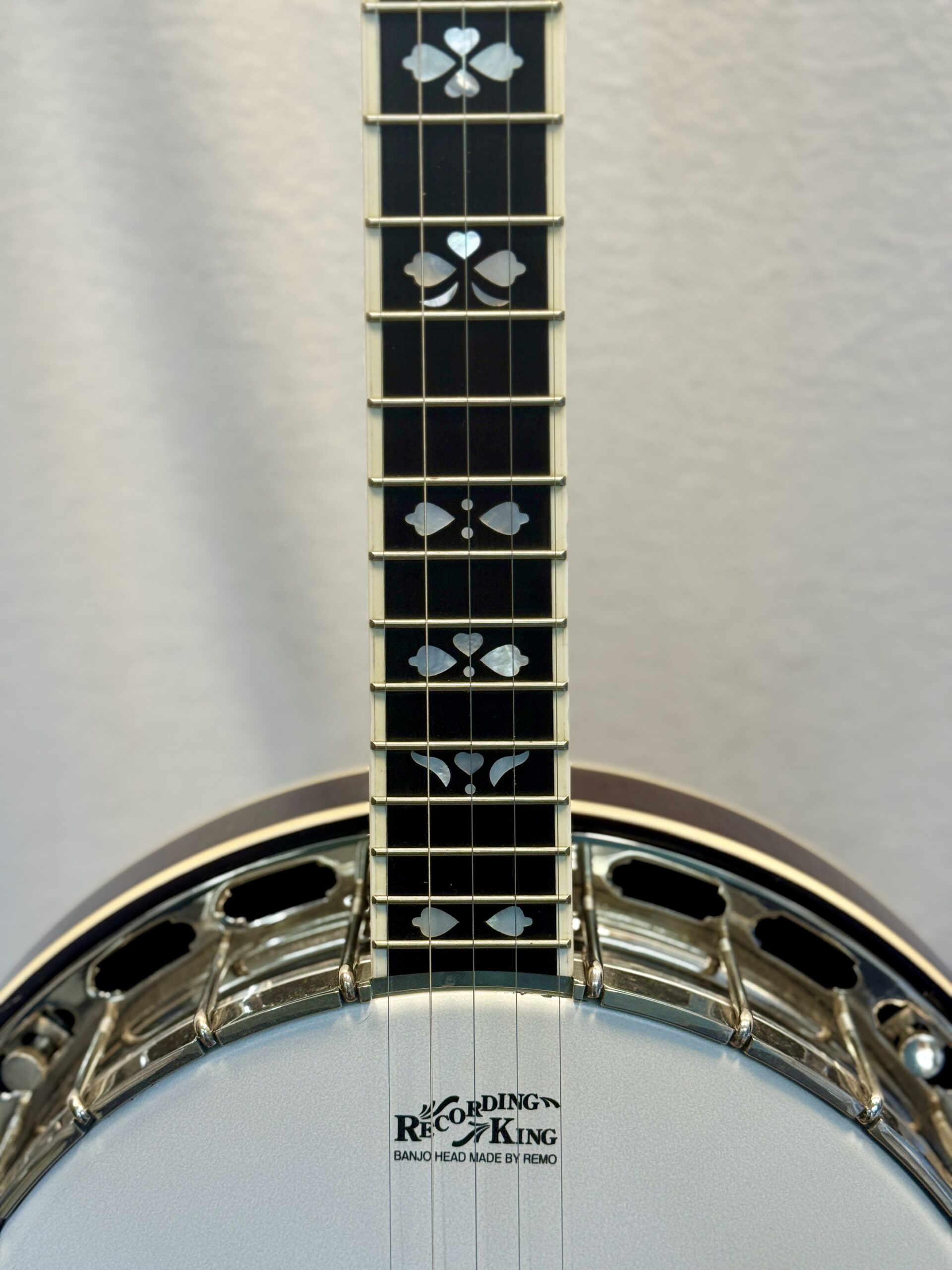 Exceptional 2008 Recording King RK-CUSTOM Soloist RK-R85-SN with gorgeous flamed maple resonator, figured maple neck, and vintage sunburst finish. This rare pre-war style banjo features Mastertone-style hardware, dual coordinator rods, and beautiful Style 6 floral inlays. Excellent condition with hardshell case. Increasingly difficult to find since Recording King’s closure.