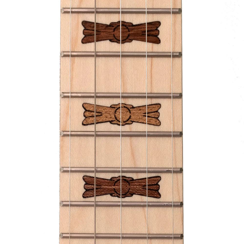 The slender rock maple neck plays fast and comfortable, with a 1 1/4″ nut width and Art Deco inspired hardwood inlays on the maple fingerboard. At only 4.5 lbs, it is light enough for children and adults alike, and easy to travel with. The US Bronze powder finished hardware gives the Goodtime its distinctive warm aesthetic.