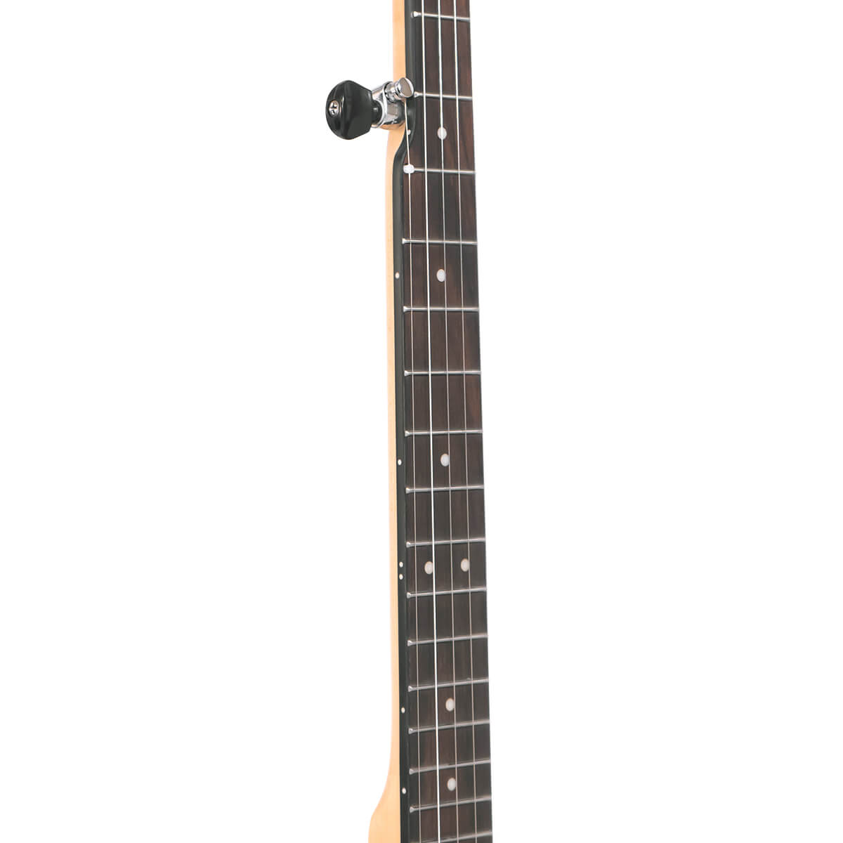 The scale length, string gauges, and tuning are all standard 5-string banjo — G D G B D — so your existing Scruggs rolls, clawhammer technique, or melodic style transfers directly. The feel under the right hand is a little different since there is no open resonating rim, but most players adapt within a few minutes. The neck profile and nut width are comparable to a conventional banjo neck, so fretting hand technique carries over completely.