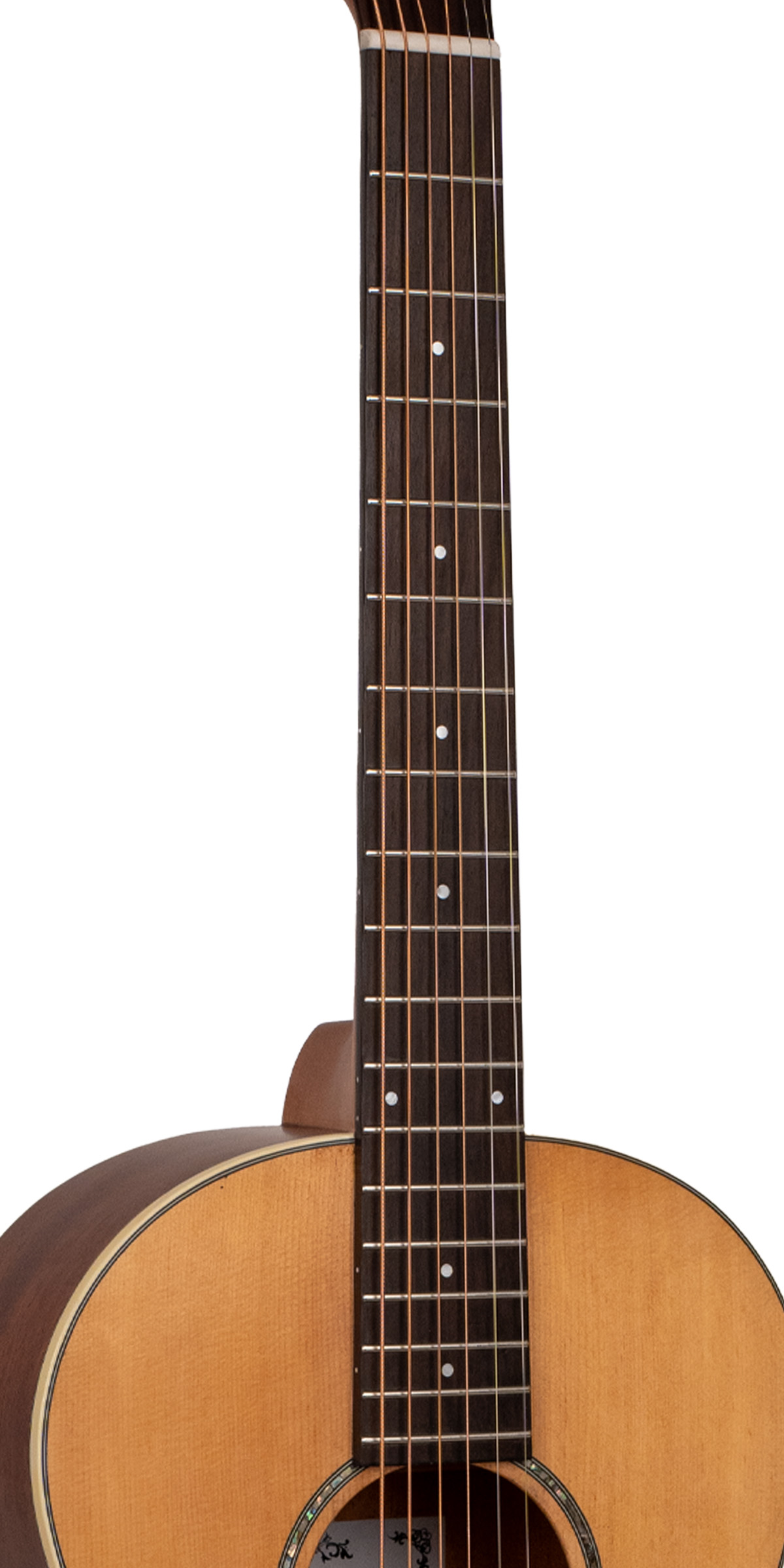 The neck is carved from solid mahogany in a slim “C” profile with a 1-11/16″ nut width — comfortable for players with smaller hands or anyone transitioning from a shorter-scale instrument, though experienced players will feel right at home too. The rosewood fingerboard with pearloid ABS dot inlays plays smooth and clean across the 25-5/8″ scale length. Grover open-gear tuners keep you reliably in tune, D’Addario strings (.012–.054) are on the instrument right out of the box, and the built-in Fishman pickup with dedicated tone and volume controls means you can go from a quiet back-porch session to a small café gig without swapping instruments. Cream ABS binding and an ebony bridge finish the look with tasteful, classic detail. It comes in a Natural Gloss finish that lets the wood grain speak for itself — no heavy burst or toner to hide behind.