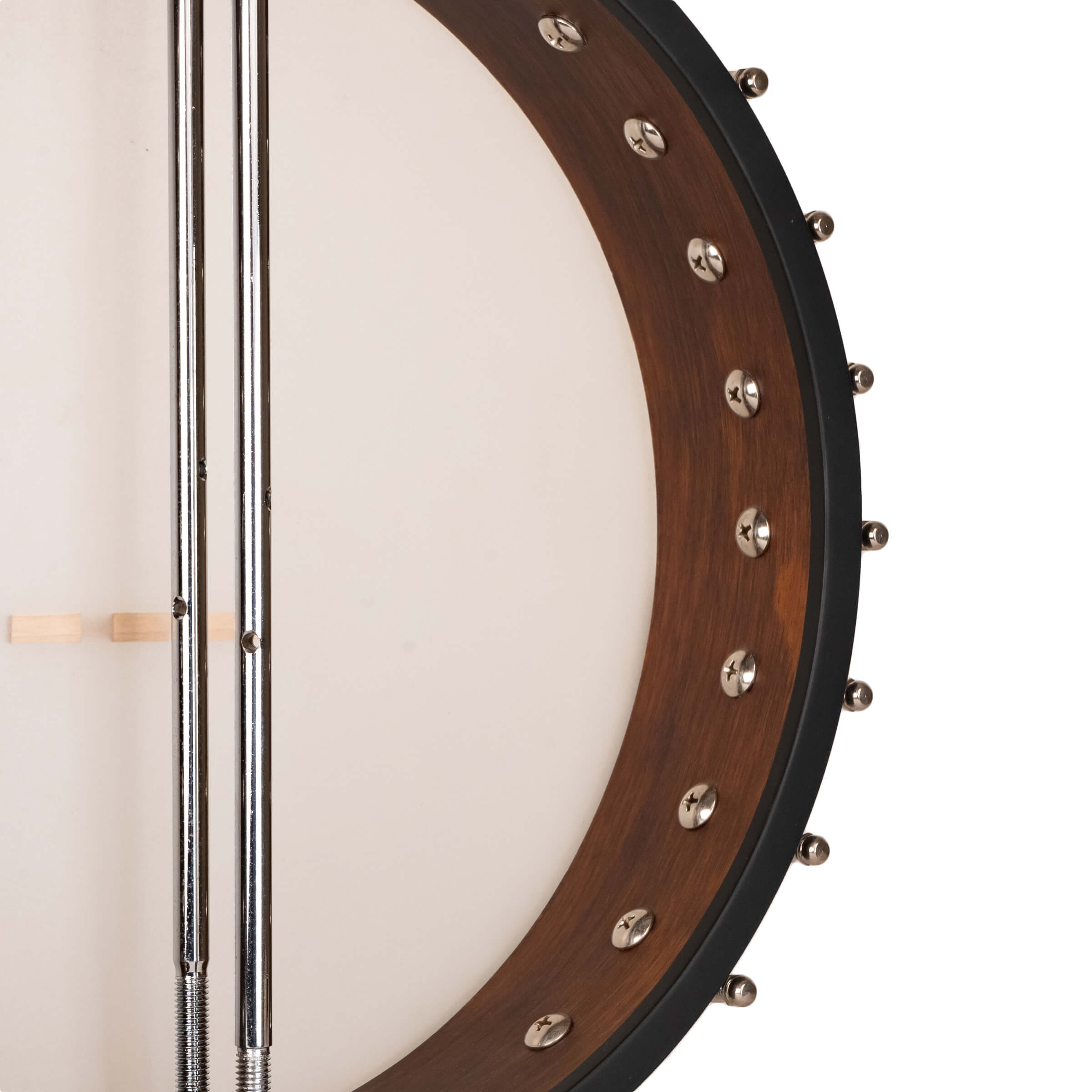 The rolled brass flat bar tone ring on the IT-17 adds warmth and bass presence rather than pushing the banjo toward a brighter, harder sound. It gives the instrument more body and sustain than a rimless or archtop setup, while still staying in a voice that cuts through in a session without overwhelming acoustic instruments around it. It’s a tone ring choice that makes a lot of sense for Irish music specifically.