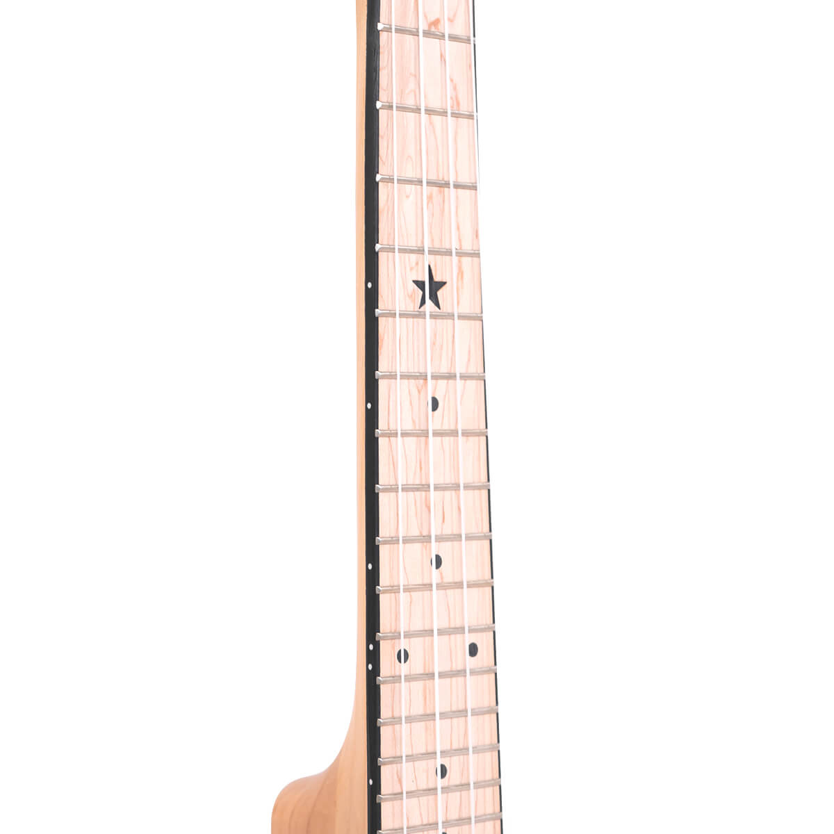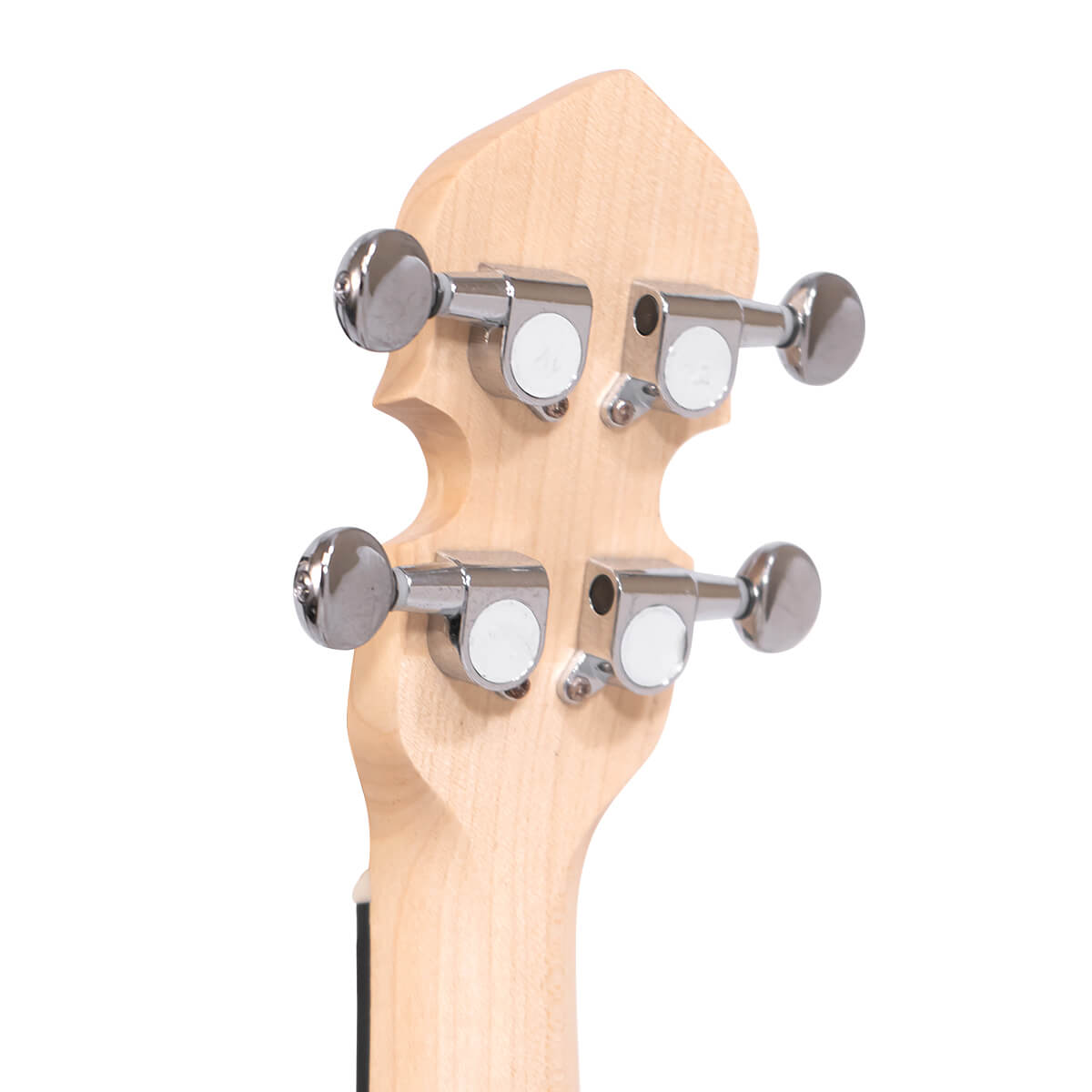 Beneath that eye-catching finish is a thoughtfully spec’d instrument. The maple neck is comfortable and stable, the 18-fret fingerboard gives you plenty of room to explore, and the bone nut at 1-3/8″ width sits right in that sweet spot for concert-scale playing. Sealed guitar-style tuners keep you in tune without fuss, the 8″ clear head over the acrylic rim delivers that characteristic banjo chime with just enough warmth, and the maple bridge with ebony cap adds a touch of tonal refinement you don’t usually see at this price. It’s tuned GCEA — standard ukulele tuning — so if you already know your uke chords, you can pick this up and be playing immediately. The chrome hardware throughout and the rolled brass flat-bar tension hoop give the whole package a clean, finished look that makes it feel more substantial than the price tag suggests.