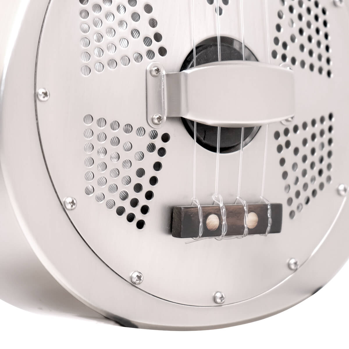 That is one of the ResoUke’s standout features. The Gold Tone/Beard coverplate has a removable palm rest, so you can access the bridge saddle, adjust the break angle, and make action changes without removing the coverplate or detaching the strings. It is a genuinely player-friendly design that most resonator instruments at this price point do not offer.