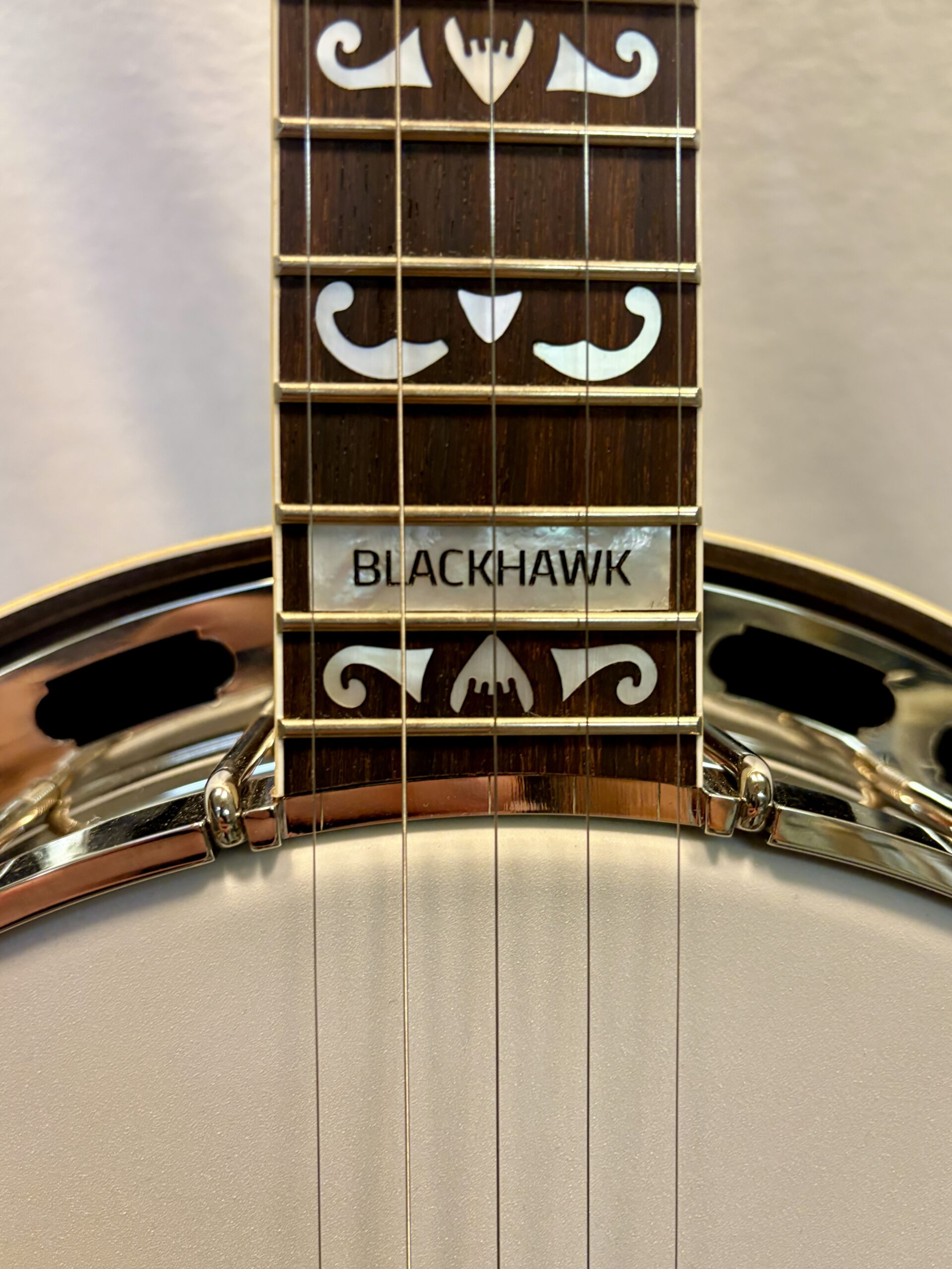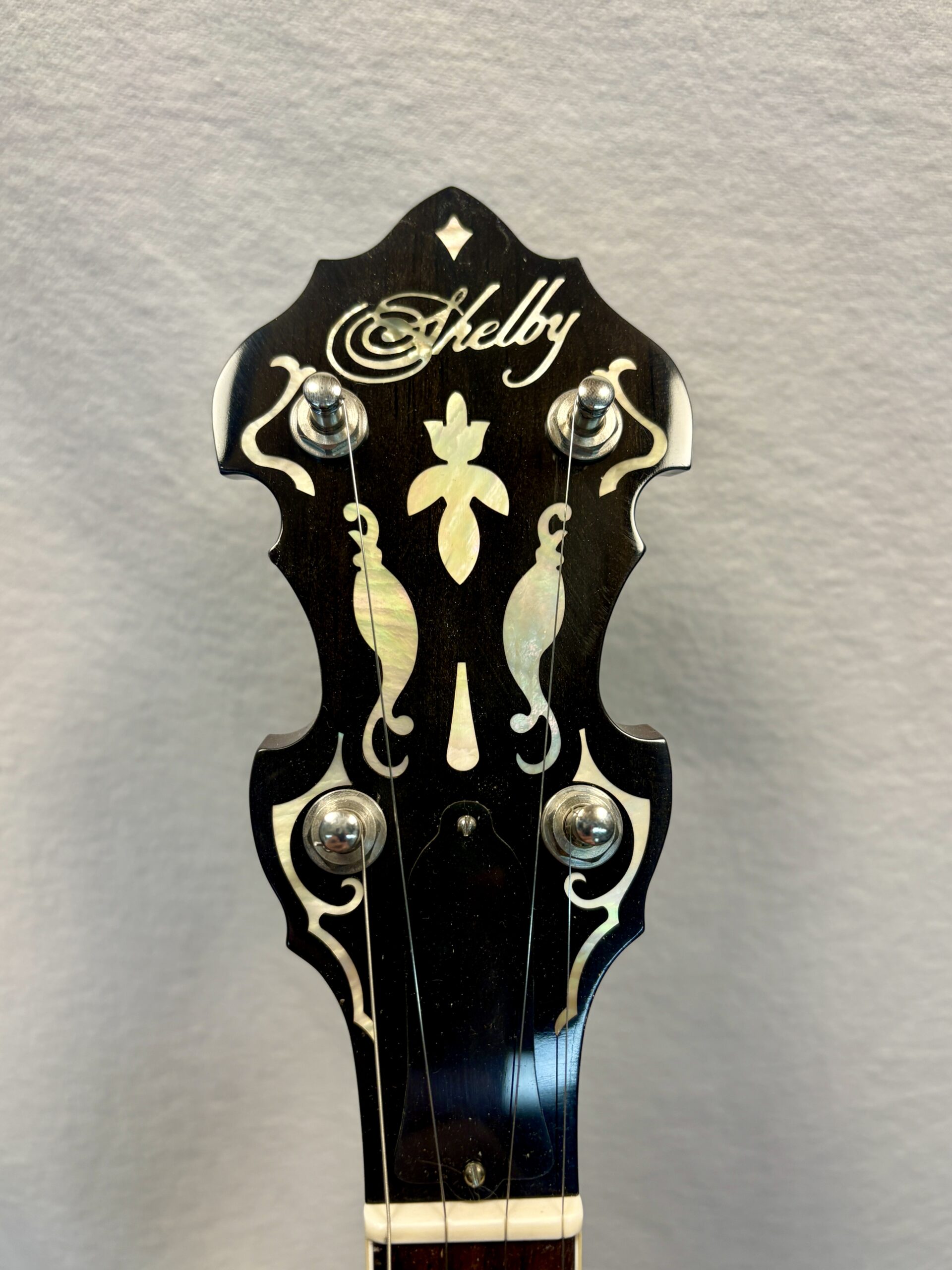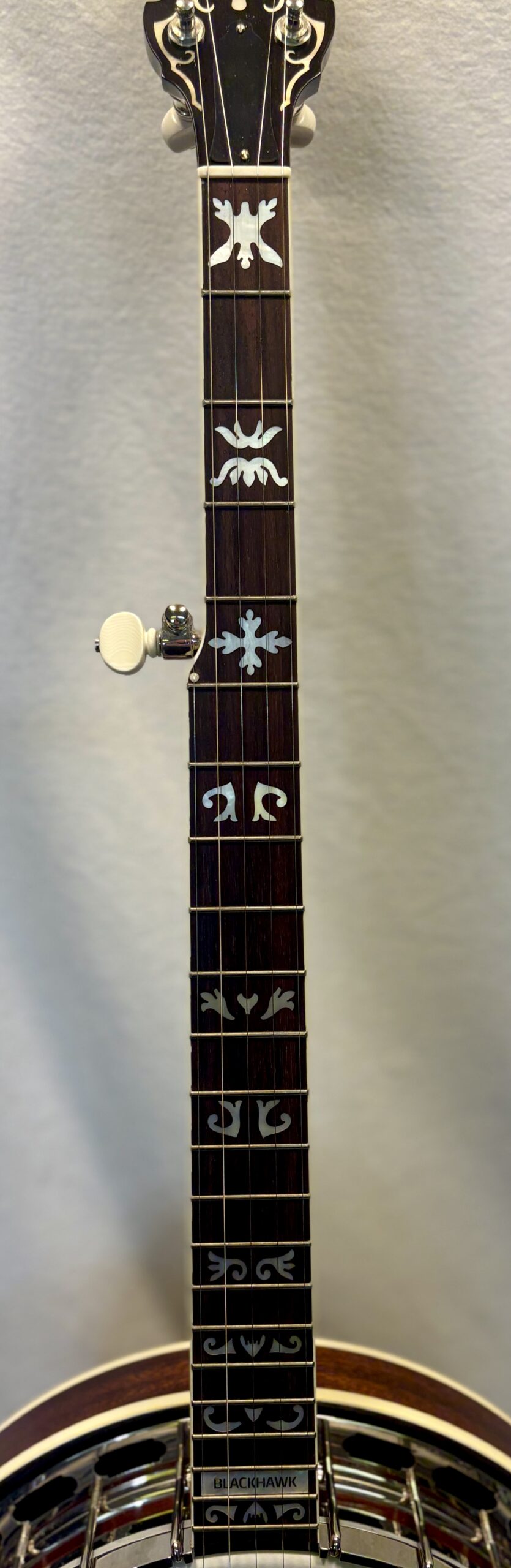 The peghead is a work of art, featuring an elaborate pearl-flying-eagle inlay, the Shelby script logo (named after Earl Scruggs’ hometown), and ornate scrollwork. The flat rosewood fingerboard showcases unique pearl inlays at every position, culminating in the “BLACKHAWK” block inlay at the 22nd fret. The mahogany neck has a rich, dark finish and Rickard tuners with white buttons.